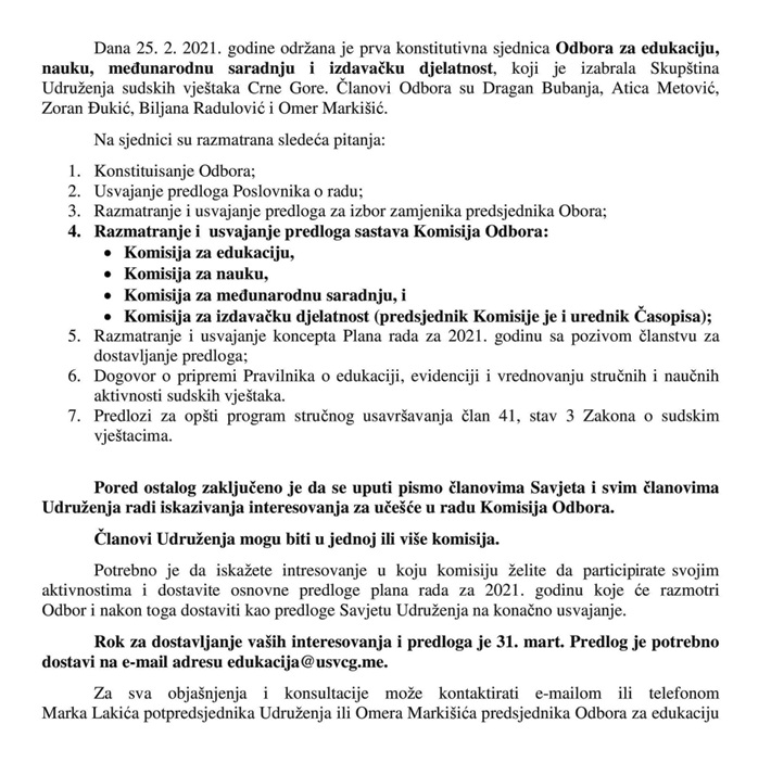 U skladu sa članom 22, 23, 24, 25, 26, 27, 31, 33 i 37 Statuta Udruženja sudskih vještaka Crne Gore predsjednik Udruženja objavljuje poziv za nastavak